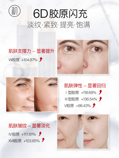 膠原補(bǔ)充層:0.5%6D膠原組合精準(zhǔn)覆蓋Ⅰ、Ⅲ、Ⅳ、V、Ⅶ、XVII型六大關(guān)鍵膠原,搭配0.101%小分子水解膠原,形成“全維度膠原灌膚”,快速填補(bǔ)真皮層膠原空缺,從根源解決肌膚松垮、皺紋問題,讓肌膚恢復(fù)嘭彈緊致;